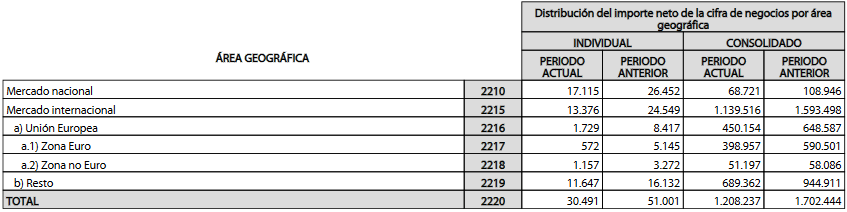 Declara unas ventas de 1.208  millones de Euros, con un decremento de 494 Millones, un 29,03% menos que en el ejercicio anterior.
