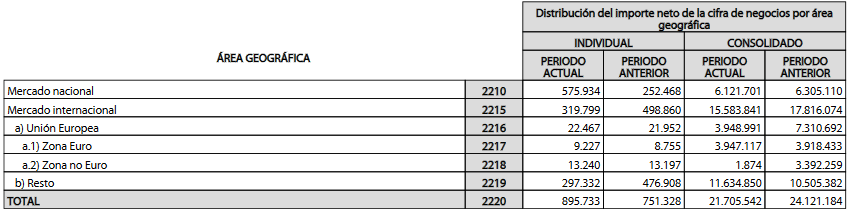 Declara unas ventas de 21,706 millones de Euros, con un decremento de 2.416 Millones, un 10,01% menos que en el ejercicio anterior.