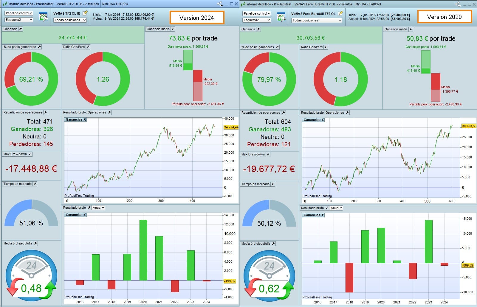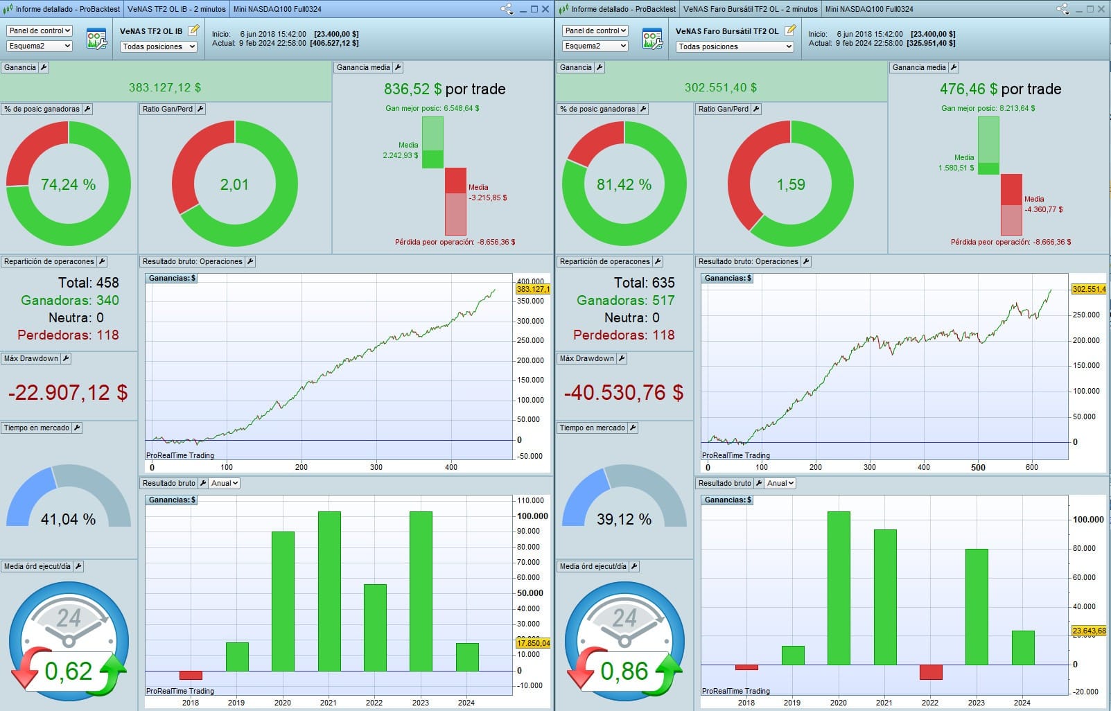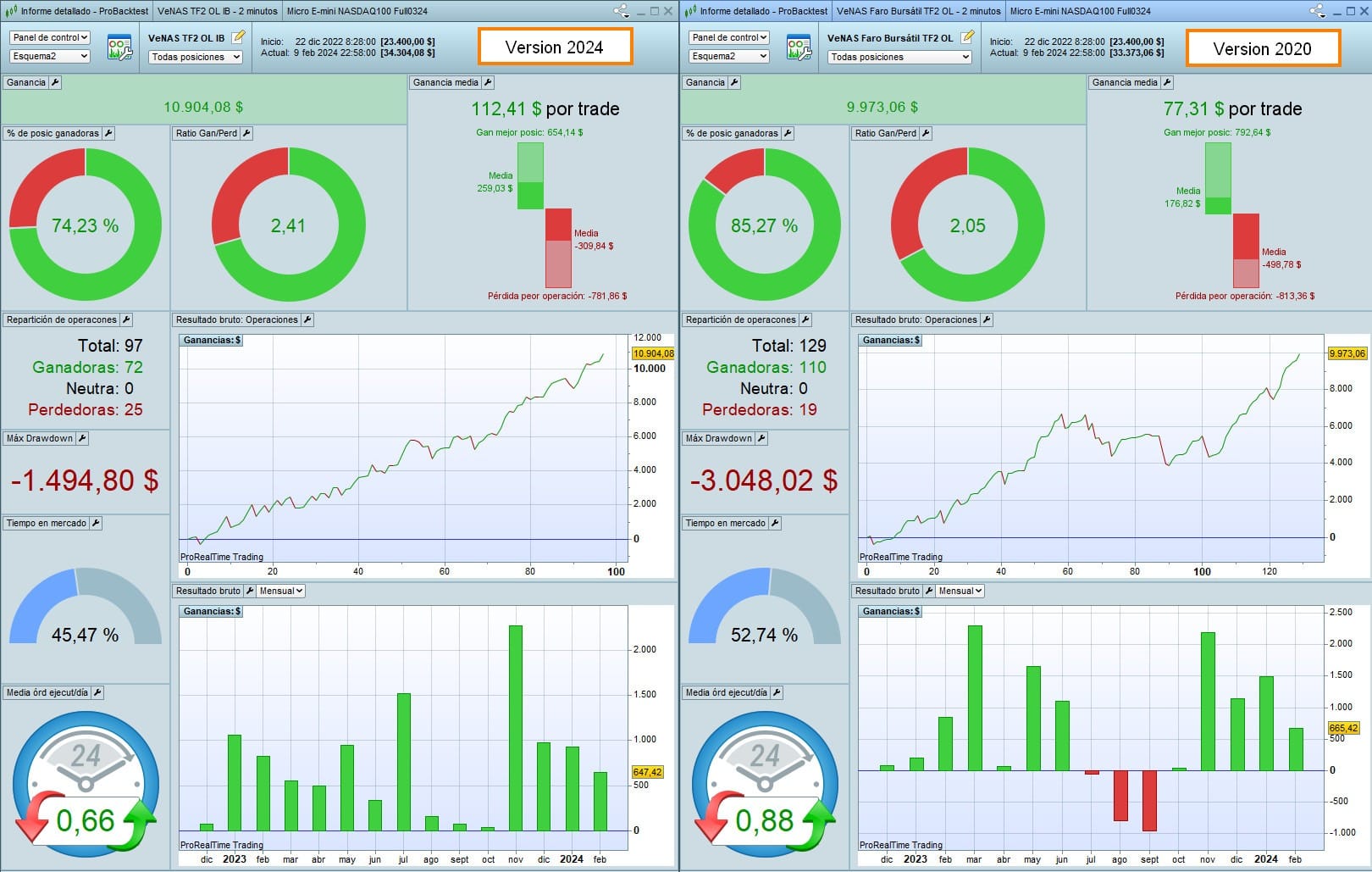 Incluso, he probado ambas versiones en el Mini Nasdaq (20$ el punto, hablamos de inversiones de 360k por contrato), donde tenemos algo de más de histórico, y ambas versiones siguen siendo brutales.