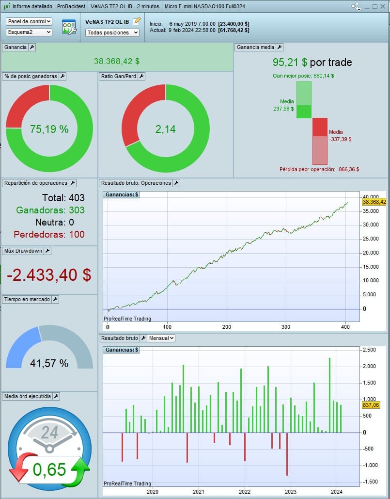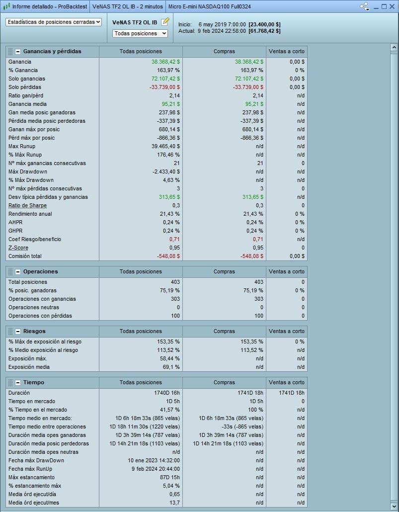 Esto es el backtest de 1M de velas. En realidad la versión OL original de 2020-2021 estaba funcionando muy bien (de hecho ahora mismo está en máximos) pero durante este tiempo han ido surgiendo mejoras propuestas por miembros de la comunidad, otras versiones, aprendizajes sobre operar con futuros, etc y por eso he querido perfeccionar la estrategia.